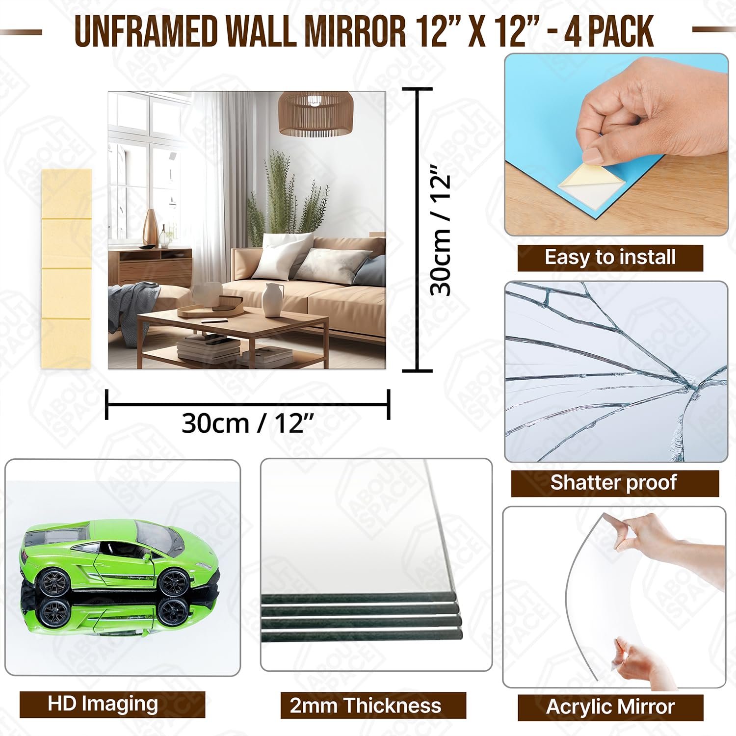 - MATERIAL & DIMENSION: This HD reflective acrylic flexible mirror is square-shaped and comes with 16 double-sided tapes, can be placed anywhere in the house and the design suits everywhere. The advantage of the water-resistant, non-glass shatterproof sticker mirror is that it is lightweight and unbreakable. The mirror measures L 30 x H 30 cm (12 x 12 inch)