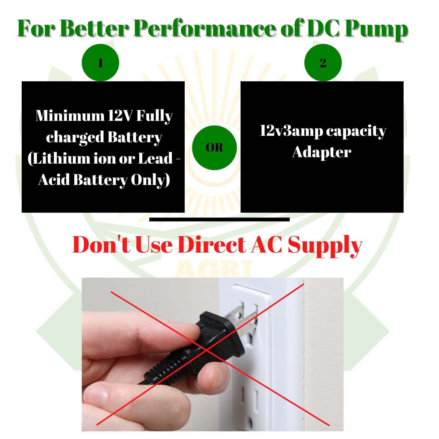 - User Guidance – To run this DC Pump effectively use minimum 12V fully charged Battery (Lithium ion or Lead – Acid Battery Only ) and if want to use DC Adapter than only use 12V3 amp capacity Adapter Only.