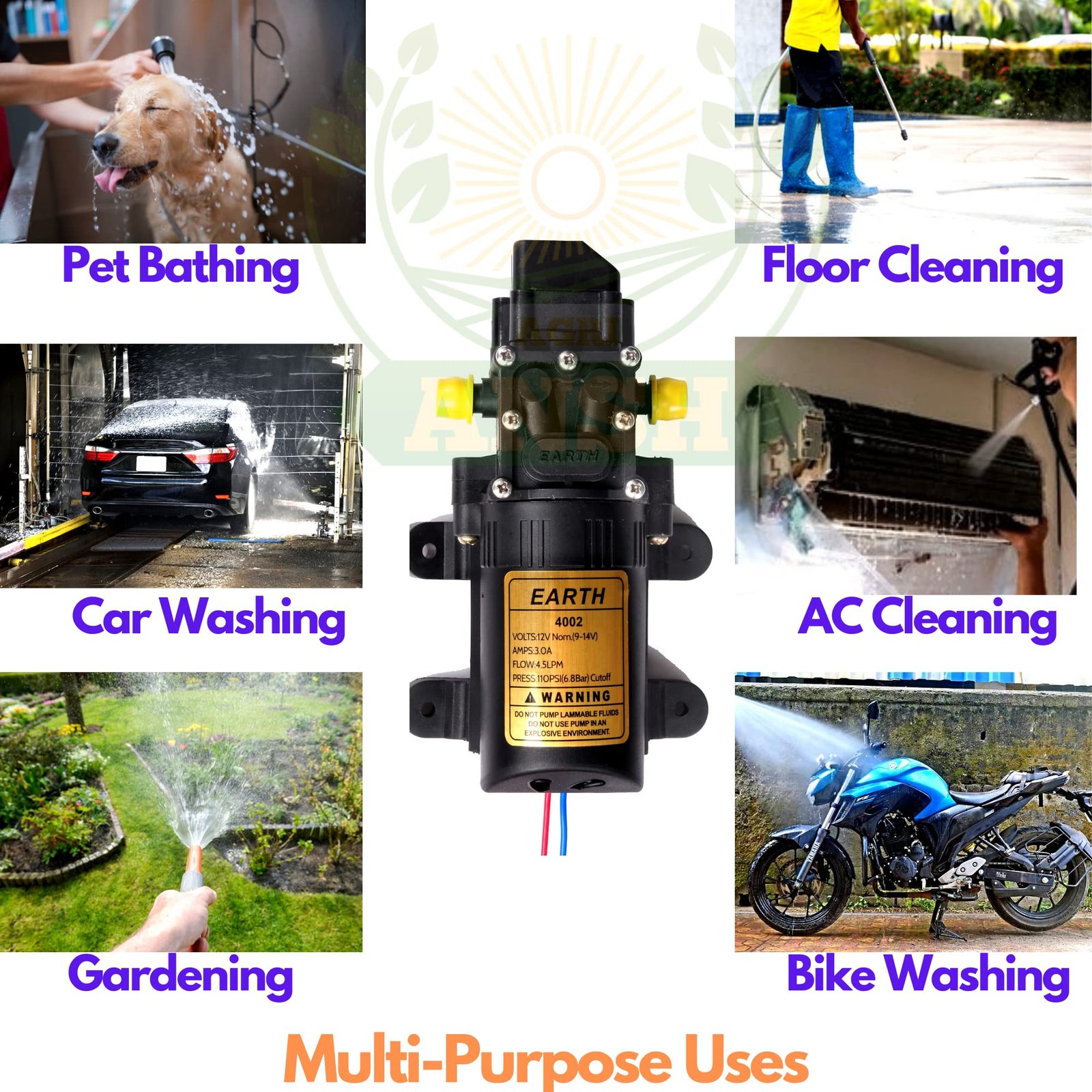 - Multi Purpose Use – Agriansh DC High Pressure Diaphragm Pump is used as Car Washer, AC Service Cleaning, Misting System, Agriculture Drip Irrigation System, Bike Washing, Solar Panel Kit, Shower, Agriculture Spray, Floor Cleaning in House, Tank Filling, Aquarium and as a Sprinkler in Garden.