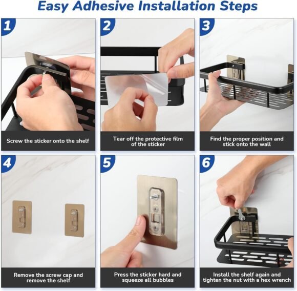 - ADHESIVE SHELF FOR BATHROOM : Our bathroom shelf is designed with a powerful adhesive that ensures secure mounting on your bathroom wall. It’s easy to install without any drilling, making it perfect for renters or those who prefer a damage-free setup.