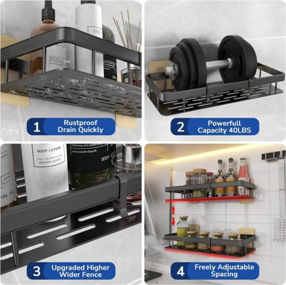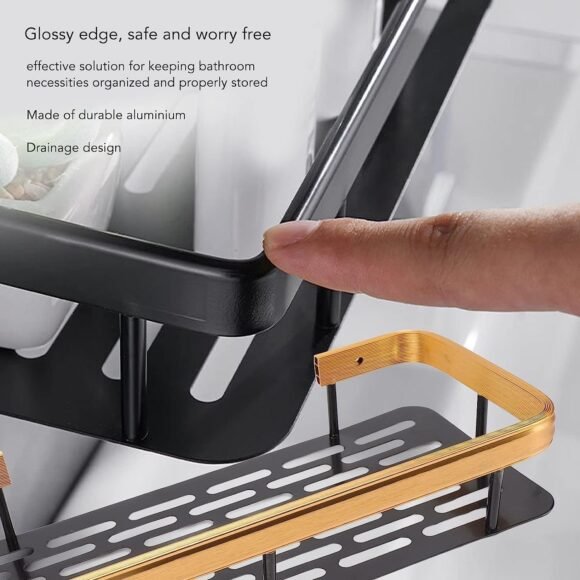 - DURABLE AND STURDY : shower shelf is made of aluminum material, hard and durable, no rust, no fading and no deformation. You can use the rustproof shower shelf for years. Thicken design can promise to hold more weight, up to 10Kg. The hollow bottom design help drain fast, to keep bath accessories clean and dry. The black color and smooth arc edge design convey modern decoration.