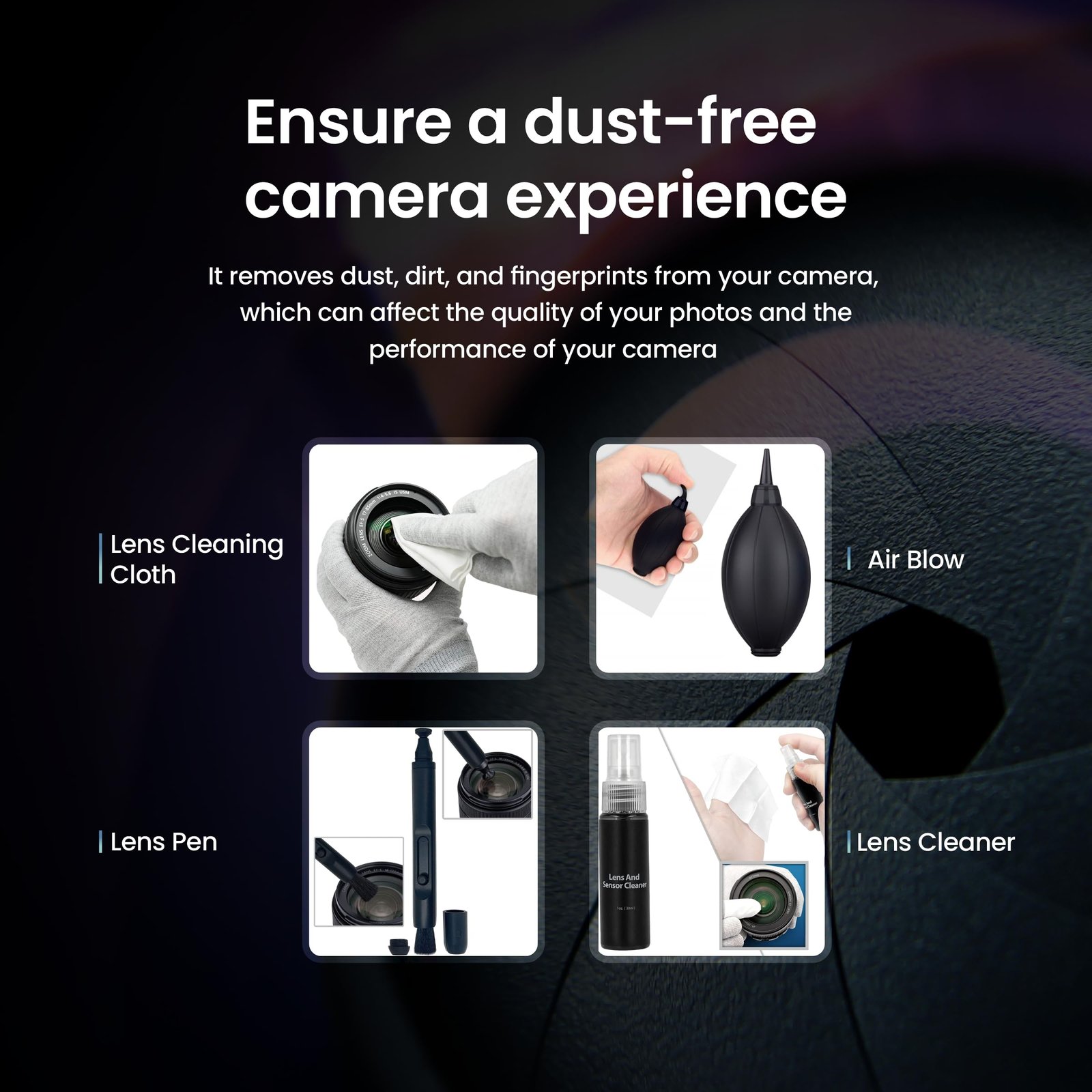 - Includes Powerful dust air blower, Lens Cleaning Pen, Lens Cleaner 30 ml, 6pcsLens Cleaning Wipe, 2pcs Full Frame Sensor Swab, 1 pack (50pcs) Lens Tissue 50pcs, 2 pcs Microfiber Lens Cleaning Cloth & Travel Case