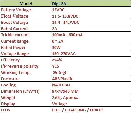 Details: ModelDigi-2A Battery Voltage–12VDC Float Voltage–13.5- 13.8VDC Boost Voltage–14.4 – 14.7VDC Rated Current–2A Trickle current–100mA – 600 mA Current Range–0 ~ 2A Rated Power–30W Voltage Range–180~270VAC Efficiency>94% I/P reverse polarityYES Working Temp.– 85DegC Enclosure– ABS Plastic Cooling–NATURAL Dimension– (L*W*H)97x47x43 MM Weight–250g. Approx. Display–Voltage LEDS–FULL / CHARGING / ERROR