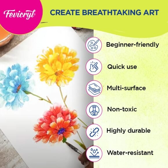 Fevicryl Acrylic Colours Sunflower Kit | 10 Colours x 15 ml | DIY Paint, Rich Pigment | Multicolour & Multi-surface | Non-Cracking Paint for Canvas, Wood, Leather, Earthenware, Metal
