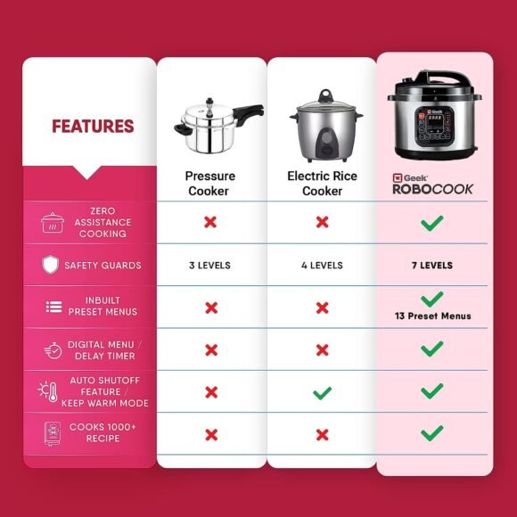 - WORLD CLASS SAFETY: Geek Robocook Zeta is certified with “BIS Safety Standard” from the most trusted Apex Body for testing & certification of Electronic Appliances (India) also designed with the safest pressure release mechanism compared with any other pressure cooker brands.