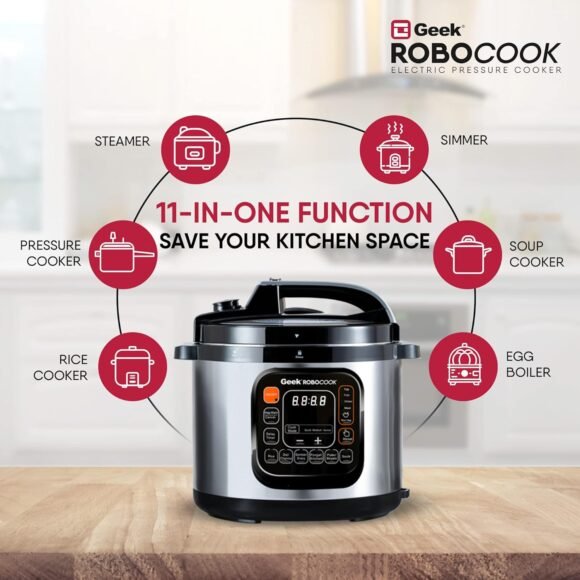 - REVOLUTION IN COOKING: Geek Robocook Zeta is the most revolutionary instant one pot multi cooker developed with advanced PIC TECHNOLOGY that replaces all your kitchen utensils yet allows you to pressure cook, cook rice, sauté, steam, bake, etc., thus saving up to 70% of your cooking time.