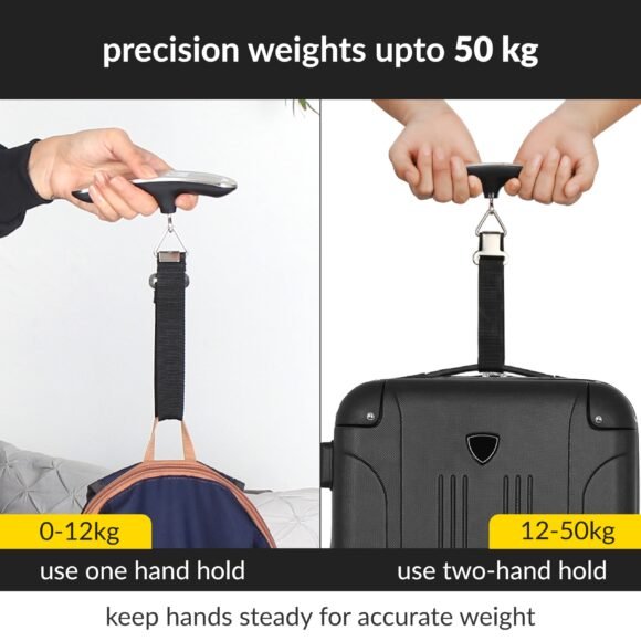 • 50 KG WEIGHT CAPACITY: Gotrippin luggage weight machine have 110 lb / 50 kg capacity with precision accuracy of 0.2 lb / 0.1 kg; Long life CR2032 battery included in this bag weighing scale for luggage;for accurate weight hold the hands steady and parallel to ground; for weight above 12 kgs please use both hands.