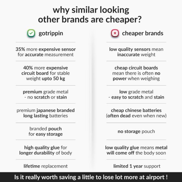 • STURDY AND DURABLE WITH LONGLASTING BRANDED BATTERIES: stainless steel top and ABS plastic bottom ; Weight:150 gms; Dimensions: 14x3x5.3cm; compact and lightweight weighing machine for luggage; comes in premium GoTrippin branded gift box packaging; one 3V CR2032 battery is included with this portable weight machine