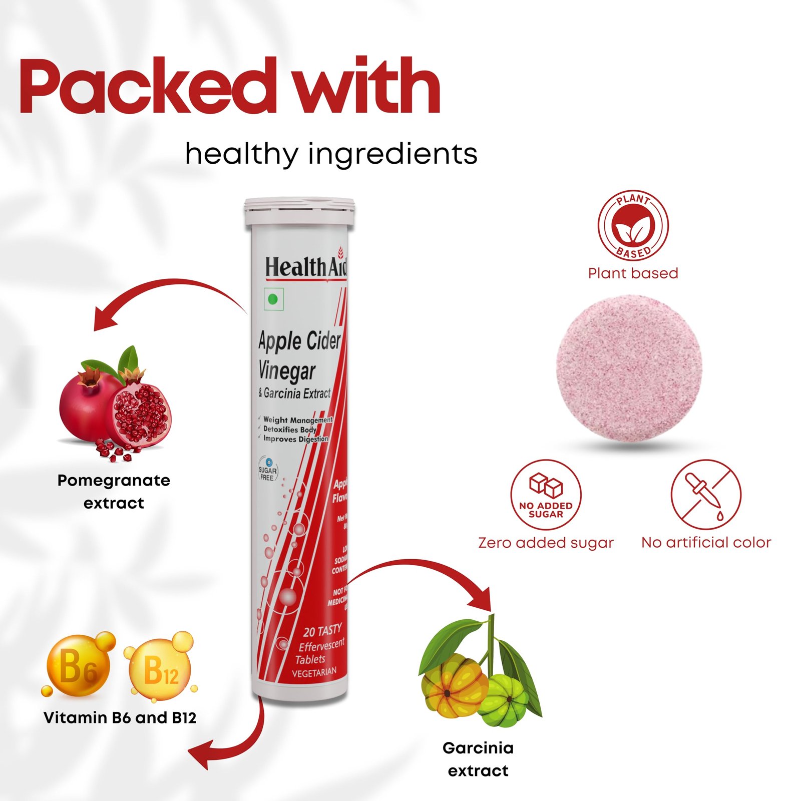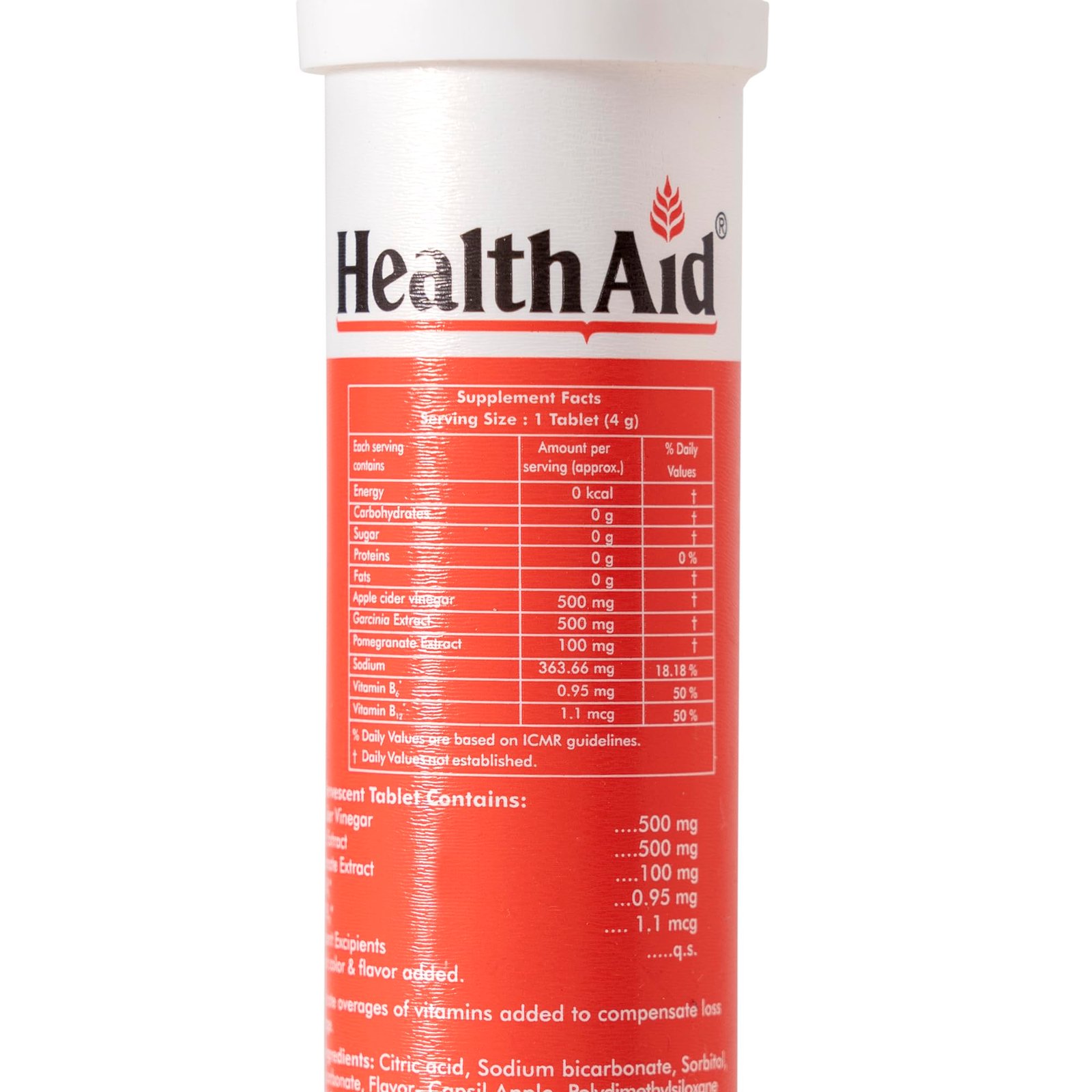 Details: About the product: HealthAid ACV apple cider vinegar tablets are designed to support your wellness journey with ease and convenience. Combining the natural benefits of ACV (apple cider vinegar) and garcinia extract, these tablets may assist in healthy weight management and digestion. They dissolve effortlessly in water, creating a refreshing drink without the strong taste of traditional apple cider vinegar. Infused with essential vitamins B6 and B12, these effervescent tablets may help energize your day and promote overall well-being. Sugar-free, vegan, and perfect for busy lifestyles, they provide a natural option for those looking to enhance their wellness routine. Choose HealthAid apple cider vinegar tablets for a simpler approach to health.