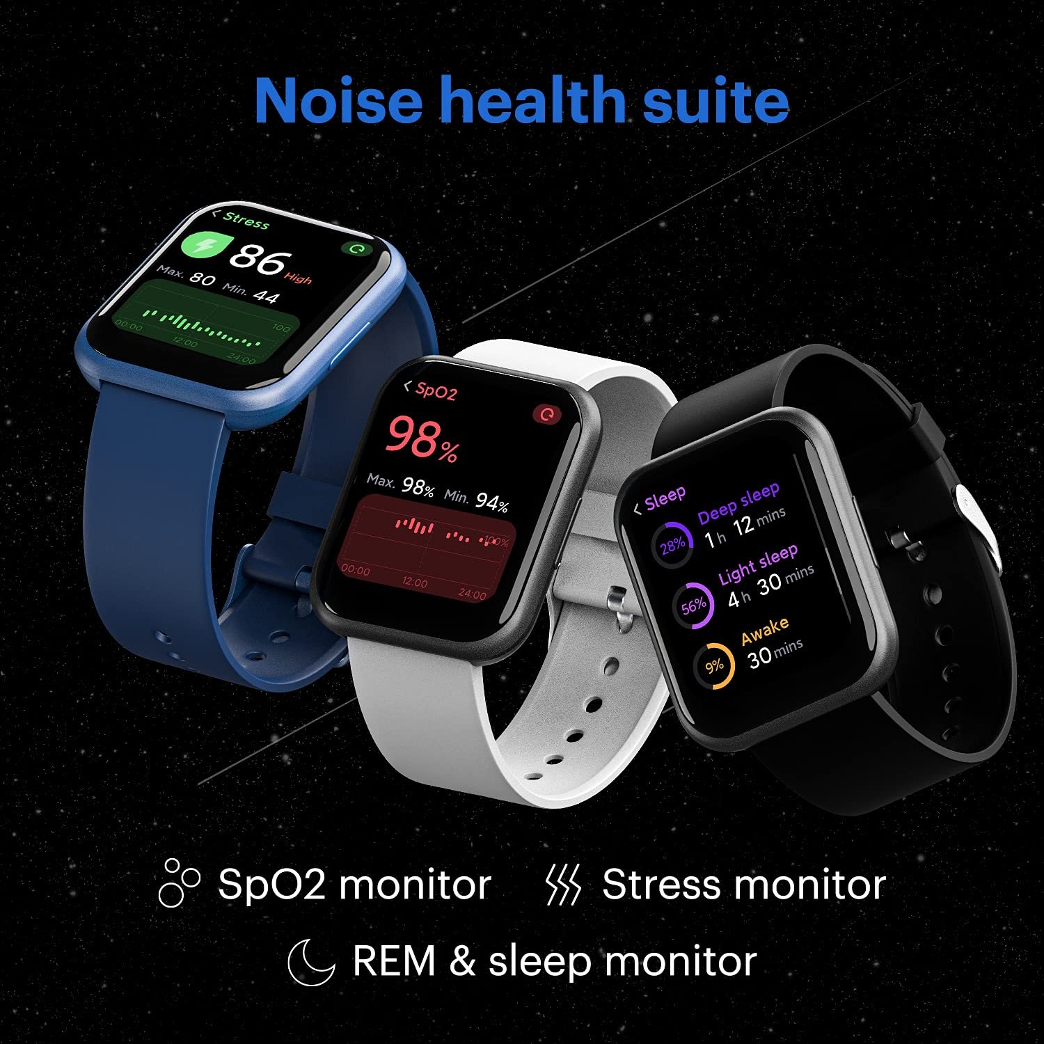 - Personal health assistant: Take care of your health with features like blood oxygen, heart rate, stress, REM & sleep monitors.
