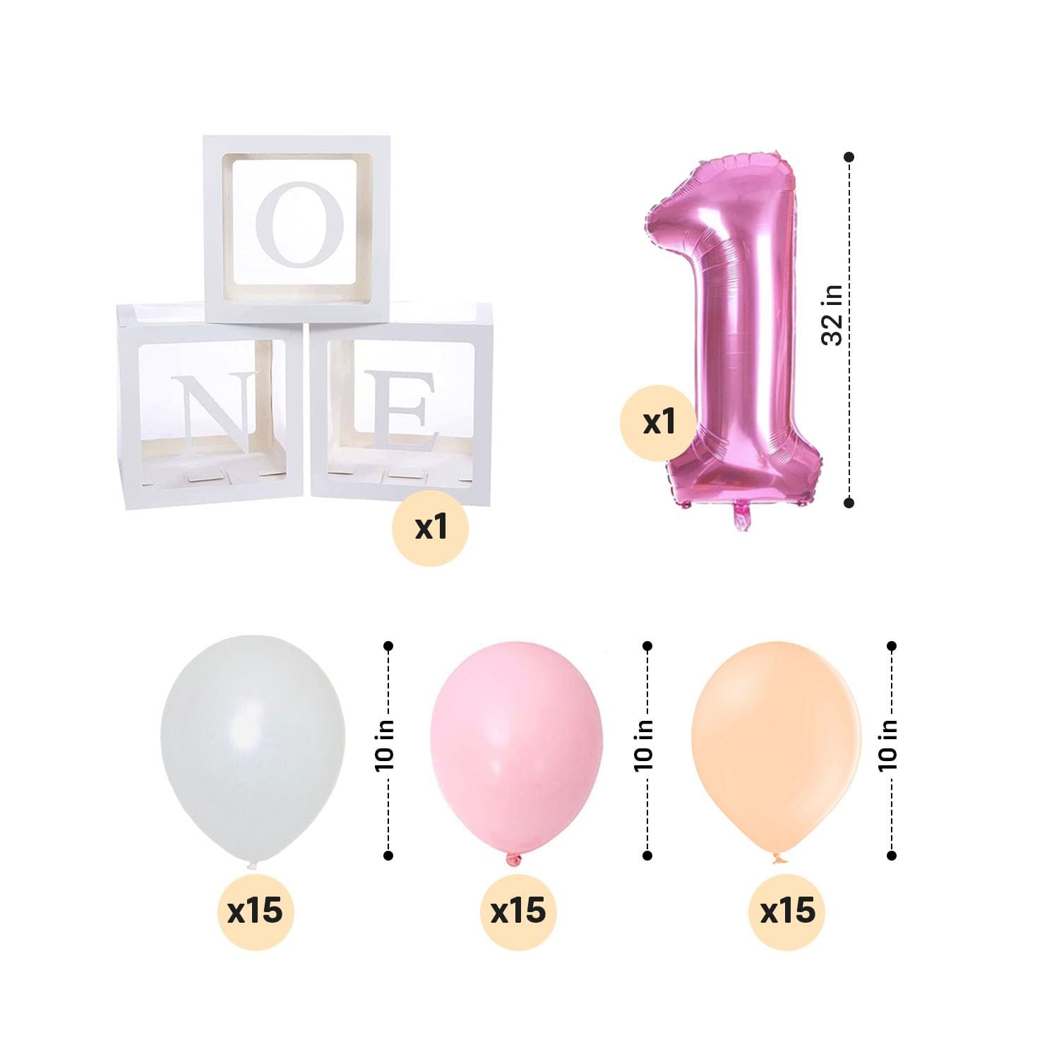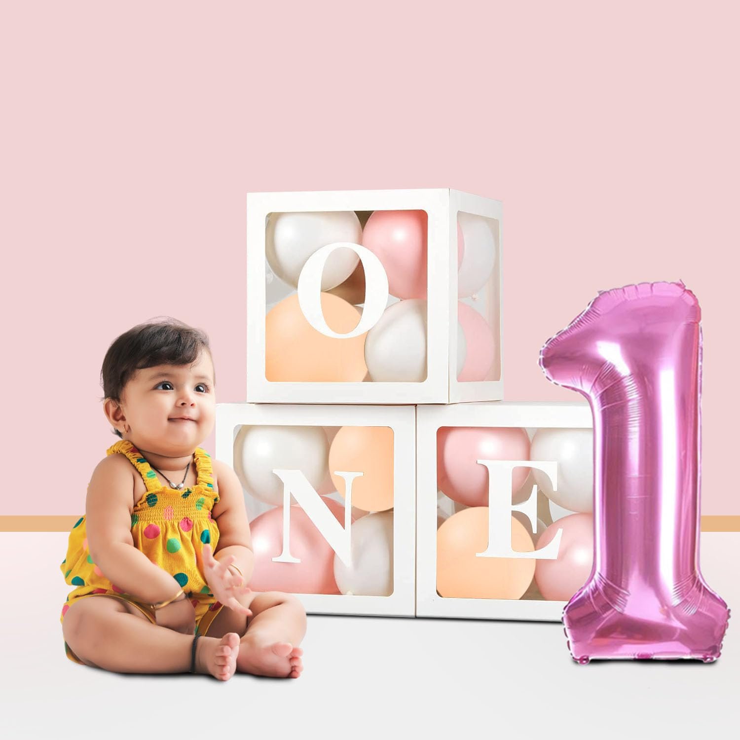 Celebrate your child’s first birthday in style with the Party Propz Birthday Decoration Set, specially designed to make this milestone truly memorable. This all-in-one 47-piece kit includes everything you need to create a beautiful and festive atmosphere for your little one’s special day. The set features 15 light pink, 15 light peach, and 15 white pastel balloons, along with a standout “1st” foil balloon and a unique “One” box balloon that adds a personalized touch to your décor. SUGGESTED USES