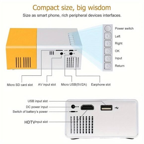 Smart Portable Mini Projector YG-300: 4K Supported 1080P Home Theater with USB & Remote, Compatible with Smartphone, Laptop & TV Stick