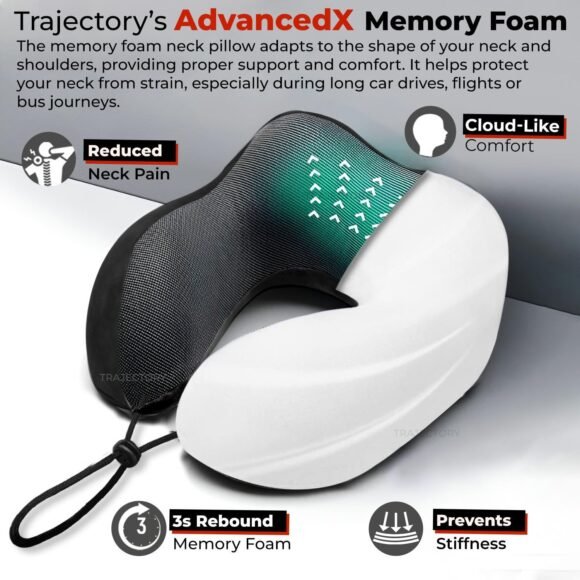 Trajectory Travel Neck Pillow 3 in 1 Combo with AdvancedX Orthopedic Memory Foam and Eye Mask and Carry Bag Combo for Travel in Car Flights Train Airplane and Cervical Pain