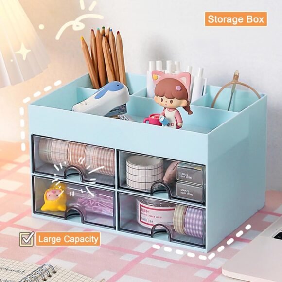 Zeinwap Plastic Multi-Functional Desk Organizer With 4 Compartments & 4 Drawer Desktop Office Supplies Stationery Storage Box Cosmetic Organizer For Pens Staplers Clips Sticky Notes (Blue)